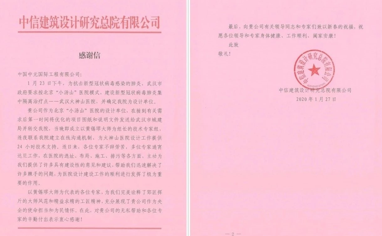 现在,武汉市火神山医院顺利建成、并投入使用,1 月 27 日,中国Uwin电竞,中国有限公司官网收到了来自中信建筑设计研究总院有限公司(以下简称“中信设计院”)发来的感谢信。中信设计院在信中表示,中国Uwin电竞,中国有限公司官网第一时间送达小汤山医院图纸,并提供 24 小时技术支持,帮助其解决了设计过程中的诸多棘手问题,推动了医院设计建设工作的顺利进行。中信设计院对中国Uwin电竞,中国有限公司官网的无私帮助和辛勤付出表示感谢,对黄锡璆博士郢匠挥斤的大师风范表达了敬意。